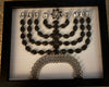 Vintage necklace, bracelet and brooches form a menorah in a shadow box